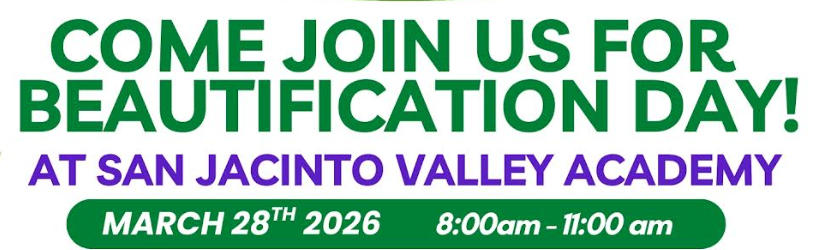 San Jacinto Valley Academy Beautification Day! Come join us March 28th 8-11am. Published March 19, 2026 Print